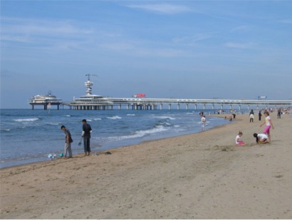 Scheveningenin rantaa ja "laituriravintola".