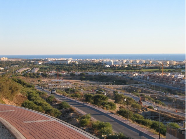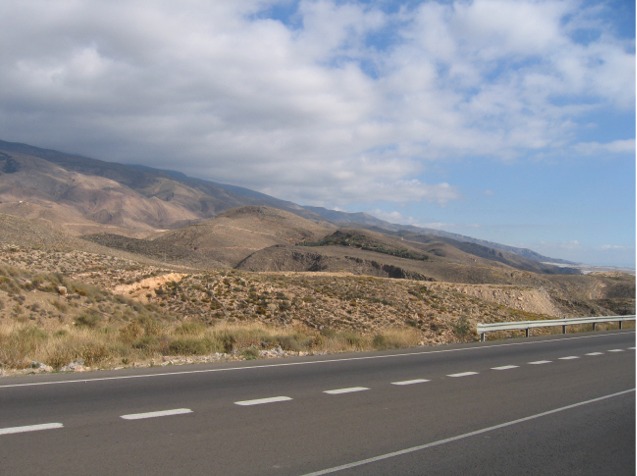 Almerimarista pohjoiseen matkalla El Ejidoon tai ostoskeskukseen edessä on aina iso mäki, jonka varrelta tässä näkymä etelään, kohti Almerimaria.