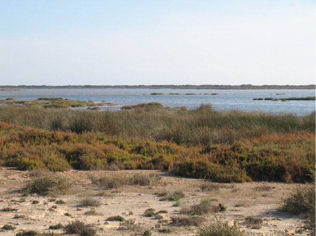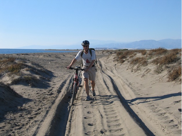 Torstaina 18.11. aamulla Ari pyöräili ensin ostoskeskukseen (7 km:n päähän) ostamaan minun pyörääni uuden sisärenkaan, jonka hän oli jo kerran paikannut ja taas se oli aamulla tyhjä. Minä kokosin kuvagallerioihin kuvia. Iltapäivällä lähdimme pyöräilemään rannan suuntaista hiekkauraa itään päin. Ensin suuntasimme läheiselle luonnonsuojelualueelle. Alueella on lampi, jonka vesi on kaiketi suolaista, sillä laguunin (lammen) ympärillä maanpintakin on suolan valkaisemaa. Lammella on runsas lintuyhteisö, jossa meitä ilahdutti erityisesti nähdä haikaroita ja flamingoja. Jatkaessamme matkaa itään päin, kulku-ura välillä heikkeni, mutta kun se sitten taas parani, niin päätimme jatkaa matkaa. Kartan mukaan eräässä niemessä olevan majakan kohdalta lähtee tie pohjoiseen ja sitä kautta pääsisimme kiertämään takaisin Almerimariin. Pyöräilymme oli välillä melkoista mukeltamista pehmeässä hiekassa ja lopulta oli niin pehmeää, että pyörän työntäminen oli ainut mahdollisuus edetä. Majakka näytti olevan jo aika lähellä, mutta lopulta etenimme pyöriä työntäen noin 5 km (meillä oli käsi-GPS mukana, mistä näimme matkan). Emme olleet arvanneet matkamme kestävän näin kauan ja asumattomilla seuduilla; meillä ei ollut juotavaa mukana, hiki valui ja lopulta aloimme jo epäillä pimeän yllättävän meidät. Eksymisvaaraa ei toki ollut, olimmehan tulleet koko ajan vain rannan suunnassa, mutta meitä ei todellakaan kiehtonut ajatus lähteä takaisin päin pyörää työntäen; oli se sen verran kovaa hommaa. Majakalle ehdimme kuitenkin ennen pimeää ja vielä takaisin Almerimariinkin. Loppumatkamme kulki keskellä kasvihuoneita, joita tässäkin kohdassa ulottuu useiden neliökilometrien alueelle. Koko reissulle tuli pituutta noin 25 km ja aikaa kului lähes 3 tuntia. Se oli arvaamaamme rankempi, mutta monia uusia kohteita (=erinäköistä luontoa) näimme ja hyvältä tuntui sen jälkeen suihku.