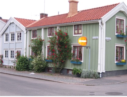Kalmarin vanhaa kaupunkia, jossa ruusut loistavat kukassaan. |
