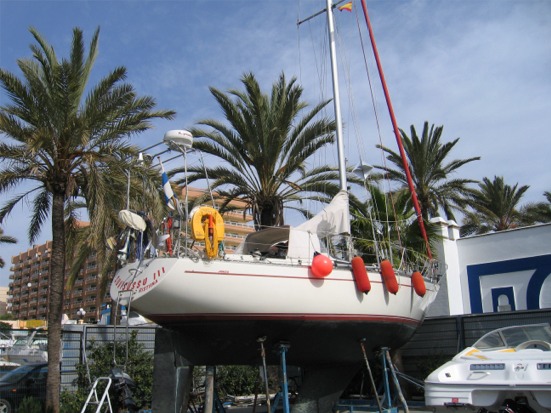 Edellisen juttumme jälkeen olemme viettäneet aikaa kirjaimellisesti palmupuiden alla. Suvisussu nostettiin nimittäin ylös telakalle palmujen alle. Viime kesänä ja syksynä koko tulomatka meni ilman mitään suurempia ongelmia, mutta nyt oli sitten edessä ensimmäinen haaveri. Oikeastaan tilanne alkoi jo Almerimarissa, mutta vasta Fuengirolassa selvisi ongelman vakavuus. Nimittäin Almerimarissa veneen ylösnostossa nostoliina jäi potkurin lapojen alle ja Suvisussua ehdittiin nostaa noin 50 senttimetriä ennen kuin asia huomattiin. Kotisatamassamme Ristiinassa veneemme nostetaan ns. yksipistenostona eli liinoja ei käytetä lainkaan, eikä tuollaista vaaraa ole silloin olemassa. Almerimarissa telakalla ollessamme katselimme ja kokeilimme potkuria, mutta mitään vikaa emme havainneet. Vasta kun lähdimme Almerimarista liikkeelle, huomasimme, että potkuri täristää tietyillä kierrosluvuilla ajettaessa. Normaaleilla matkakierroksilla tärinää tuskin havaitsi.