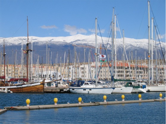 Almerimarin satamaa 5.3. Lähivuorilla (15-20 km:n päässä) lumiraja on alhaalla, huiput kohoavat reiluun 2200 metriin.Vaikuttaa silta, että joulukuu ja tammikuu olivat täällä, ainakin tänä vuonna, vähätuulisempia ja lämpöisempiäkin kuin helmikuu. Usein on ollut myös niin, että aamupäivät ovat ihan tyyniä, mutta sitten iltapäivästä alkaa puhaltaa. Keski-Euroopassa on tänä talvena ollut epätavallisen kylmää ja paljon lunta, samoin Pohjois- ja jopa Keski-Espanjassakin liikenne on ollut pahasti jumissa lumen vuoksi. Enkä usko, että nuo alle 10 asteiset päivät ovat täällä etelässäkään ihan tavanomaisia helmi-maaliskuun päiviä. Meidän pohjoispuolella olevassa Sierra Nevadan vuoristossa on ollut lumiraja melkoisen alhaalla ja esim. Granada, jossa kävimme helmikuun alussa, on ollut lumen peitossa. Lehdissä on ollut useamman kerran kuvia lumisista maisemista eri puolilta (jopa Etelä-)Espanjaa.