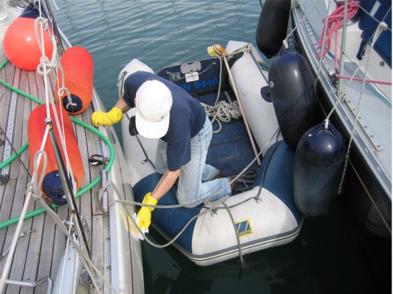 Noina viikon 8 lämpiminä päivinä (to 24.2. - la 26.2.) Tuomo pumppasi jollansa täyteen, ja Ari pesi ja vahasi veneemme kyljet jollasta käsin. Vesiletkun kanssa pesu oli aika paljon helpompaa kuin Ristiinassa keväisin, kun ämpäreillä kannamme huuhteluvettä. Vahaus olisi kuitenkin tullut varmaankin tehtyä hieman paremmin kuivalla maalla; olihan jolla vähän keikkuva työalusta. Mutta onpa nyt ainakin uusi suoja pinnassa. Muutakin huoltoa on pikku hiljaa tehty valmiiksi paluumatkaa ajatellen (mm. vaihdettu löpösuodattimet, öljyt vaihdettiin jo ennen Suomeen lähtöä).
