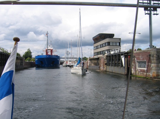 Saimaan kanavan sulkuihin tottuneina näissä sulutuksissa ei edes huomaa liikkuneensa johonkin suuntaan. Niissä on altaan reunalla kelluvat ponttonit, joiden rinnalla vene nousee tai laskee riippuen siitä, onko merellä ylä- vaiko alavesi. Päästyämme Kielin kanavaan päätimme jatkaa saman tien matkaa kanavan varrella olevaan Rendsburgin kaupunkiin, jossa emme olleet tulomatkalla pysähtyneet. Perillä olimme noin klo 11.30 ja taivalta oli takana 279 mailia, Biskajan jälkeen pisin legimme. Totesimme, miten kevyessä kelissä yöpätkät sujuvat ihan mukavasti. Yötkin ovat lyhentyneet huimasti pohjoisemmaksi päästyämme. Illalla näkee ulkona lukea lähes klo 23 asti ja aamulla jälleen jo ennen klo 5 (Keski-Euroopan aikaa). Mietimme, miltä mahtaakaan tuntua, kun pari viikkoa myöhemmin Pohjois-Itämerellä ei oikein pimeää olekaan, vain kaksi hämärää vastakkain.