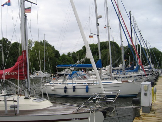 Rendsburgissa viivyimme kaksi yötä. Marina on suojaisessa lahden sopukassa, jota ympäröi vihreät rantapusikot. Maisema on tietysti aivan eri näköinen kuin vuorovesialueella, kun emme ole missään kolhossa satama-altaassa, vaan puut voivat kasvaa aivan veden rajassa. Tuli tunne kuin olisi jossakin luonnonsataman rauhassa, kuitenkin kaupungin keskusta on vain muutaman minuutin kävelymatkan päässä. Kaupunkikin on hyvin vihreä runsaine puistoineen ja lammikoineen - kokonaisuutena kaunis paikka.