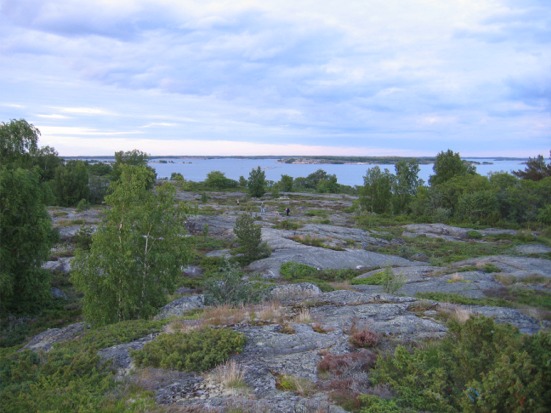 Taustalla Elisaaren tammimetsääKeskiviikkona 29.6. Ari lähti liikkeelle Elisaaresta klo 6.45, minä nukuin vielä pari tuntia. Aamupäivän aikana alkoi sataa ja sadetta saimmekin päivän mittaan useamman kerran. Tuuli vaihteli ollen välillä niin heikkoa, että etenimme vajaata 3 solmua, välillä taas piti kelata keulapurjetta jo sisäänpäin. Onneksi tuulen suunta oli meille ihan hyvä, pohjoisesta. Viime päivien viileät säät huipentuivat tänä keskiviikkona, jolloin lämpömittarissa oli kulussa ollessamme koko matkamme alhaisin päivälämpötila: klo 12 vain 9,4 astetta! Koko vuoden aikana oli veneellä ainoastaan Almerimarin talvessa ollut parina päivänä yhtä kylmää. Helsinkiin päästyämme sää oli jonkin verran seljennyt ja illaksi lämpenikin. Saavuimme 42 mailin päivämatkan jälkeen tänne Katajanokan vierassatamaan. Lähtiessämme olivat ystävämme ja tuttumme saattaneet meidät matkaan tässä samaisessa satamassa, ja nyt viivymme täällä pari päivää jälleen heitä tapaillen. Aila ja Markku ehtivätkin ensimmäisinä jo keskiviikkoiltana. He ovat olleet muutaman kerran aiempina vuosina purjehtimassa meidän matkassamme ja nyt he ihmettelivät, miten heidän "makuuhuoneensa" oli vallattu (molemmat takakajuutat ovat täynnä tavaroitamme).