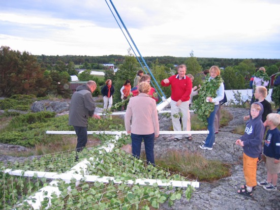 Siitä onkin aikaa, kun olemme viimeksi viettäneet juhannusta Suomessa. Ruotsissa olemme tottuneet siihen, että juhannussalko pystytetään aattona jo alkuiltapäivästä, Tanskassa poltetaan kokkoja nimenomaan 24.6. illalla ja Saksassa taas ei vietetä juhannusta lainkaan. Joskus aiemmin olemme viettäneet juhannusta Ahvenanmaalla ja silloin olemme olleet katsomassa juhannussalon pystytystä, Ahvenanmaalla ei kokkoja polteta. Nyt hämmästyimme sitä, että juhannussalko pystytettiin vasta illalla myöhään alkaen klo 22.30. Salon koristelu vei ensin aikansa ja sitten se hieman ennen puoltayötä nostettiin pystyyn. Juhannussalolla saimme ensi kosketuksen tämän kesän hyttysiin ja niitä oli paljon.
